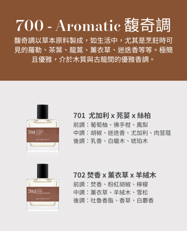 如果喜歡驚喜,就要試試這款香水 #701!它以濃郁略帶果香的清新為前味,略帶葡萄柚和佛手柑所散發的苦味。本香飽含充滿各種香味的原料:胡椒、迷迭香、香菜、桉樹、絲柏,並使溫度提升,最後與白木、琥珀和乳香巧妙交織。